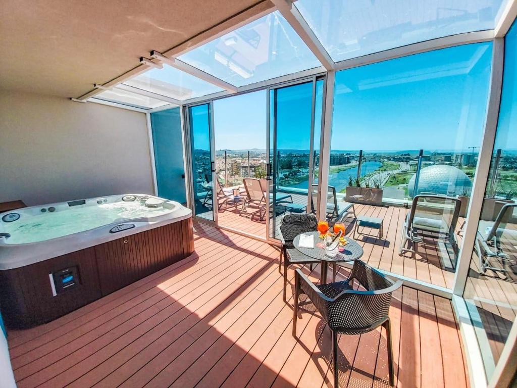 El hotel cuenta con habitaciones amplias y luminosas, restaurante de cocina internacional, gimnasio, piscina temperada y áreas verdes que invitan al descanso y la desconexión. Además, su ubicación privilegiada —a pocos minutos del centro de Concepción y rodeado de parques y lagunas— permite combinar el trabajo con momentos de relajo y conexión con la naturaleza.